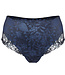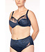 De snit van de slip werd hier voortgezet. De tuleversterking aan de voorkant geeft extra steun en vorm aan de buikstreek. Borduurinzetstuk in het voorbeengedeelte dat niet insnijdt. Zachte, diepe beenmanchetten aan de onderkant.
